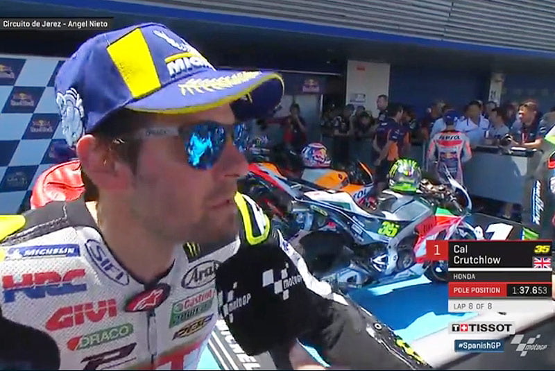 A peine descendu de sa Honda RC213V du team satellite LCR après avoir obtenu la pole position du Grand Prix d’Espagne, empochant au passage le nouveau record du circuit de Jerez-Angel Nieto, c’est un Cal Crutchlow évidemment très satisfait qui s’est confié à la caméra du site officiel MotoGP.com.