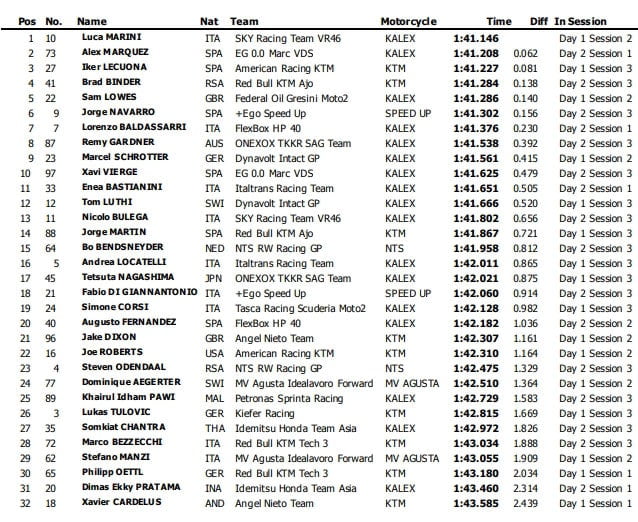 Et c’est encore un quatuor Kalex qui figurait en tête de tableau lors de la séance intermédiaire balayée par un fort vent en rafales, Remy Gardner (Kalex, Onebox TKKR SAG Team) figurant en 1’41.838 devant Álex Márquez (Kalex, Estrella Galicia 0,0 Marc VDS), Sam Lowes (Kalex, Federal Oil Gresini Moto2), Luca Marini (Kalex, SKY Racing Team VR46) et Brad Binder (KTM, Red Bull KTM Ajo).