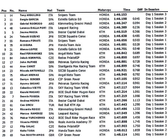 Enfin, malgré des températures qui commençaient à descendre, Tony Arbolino (Honda, Snipers Team) parvenait à s’imposer en fin de journée en 1’46.153 devant Lorenzo Dalla Porta (Honda, Leopard Racing) et Jaume Masià (KTM, Bester Capital Dubaï).