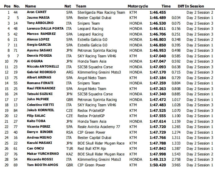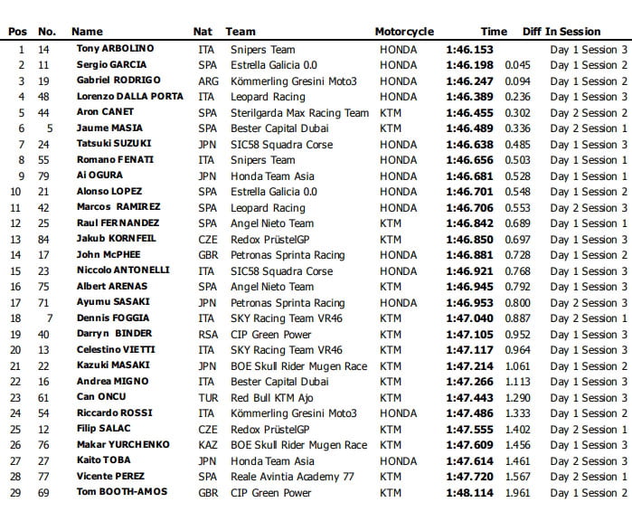 Le chrono d’Arón Canet restera pourtant le meilleur de ce vendredi, Tony Arbolino (Honda, Snipers Team), qui continue à mettre à son actif les séances de fin de journée (avec une bonne aspiration, cette fois), se contentant d’un 1’46.530 devant Lorenzo Dalla Porta (Honda, Leopard Racing) et Marcos Ramírez (Honda, Leopard Racing).
