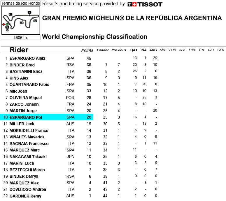 Ces deux tableaux officiels permettent de voir qu’il s’agissait de Pol Espargaró, pilote utilisant par ailleurs un casque HJC…