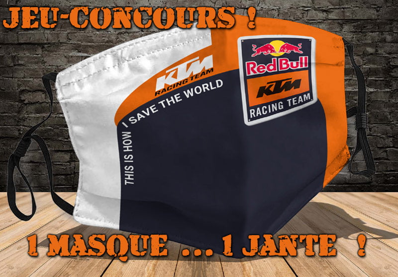 Pour des raisons de sécurité, il est évident que nous ne vous incitons pas à porter à l’extérieur les masques artisanaux que nous vous proposons de faire et qu’ils ne sauraient en aucun cas remplacer les masques préconisés par les autorités nationales (FPP2, FPP1, chirurgicaux, Grand Public, etc.). Pour le même motif, les jantes que nous ferons parvenir aux gagnants auront été, par perçage ou sciage, rendues inutilisables sur une moto mais devront uniquement servir d’élément décoratif (table basse, enrouleur de tuyau d’arrosage, customisation de brouette, etc…).