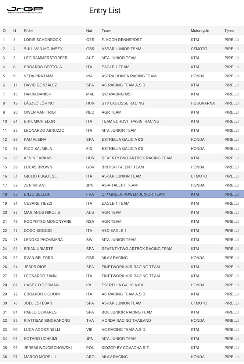 Il faut avoir 18 ans pour participer au Championnat du monde Moto3, et Enzo Bellon est né le 9 mars 2009. Il est donc encore âgé de 15 ans jusqu’au 9 mars 2025, ce qui concrètement lui laisse deux saisons en JuniorGP pour y atteindre les avant-postes, avant de faire le grand saut en 2027.