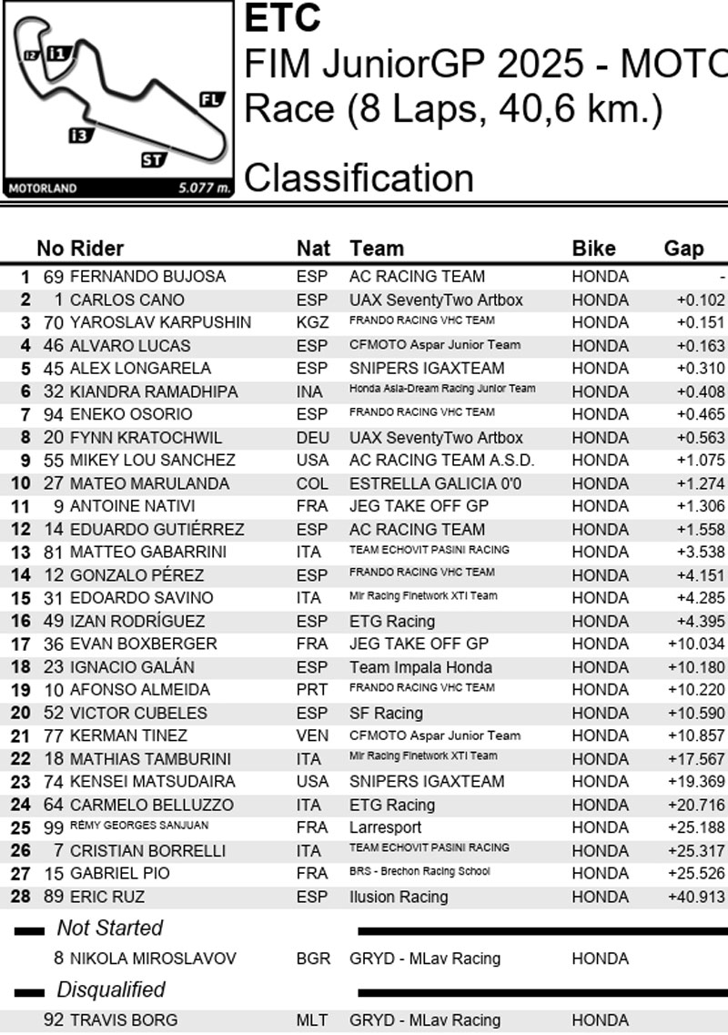 En European Talent Cup, Fernando Bujosa (AC Racing Team) a signé une troisième victoire cette saison, s’imposant dans le dernier virage face au Champion en titre et poleman Carlos Cano (UAX SeventyTwo Artbox). Le podium s’est joué dans les derniers mètres : Yaroslav Karpushin (Frando Racing VHC Team), parti 23ᵉ, a réalisé une remontée fantastique pour battre Alvaro Lucas (CFMoto Aspar Junior Team) et monter sur la troisième marche du podium.