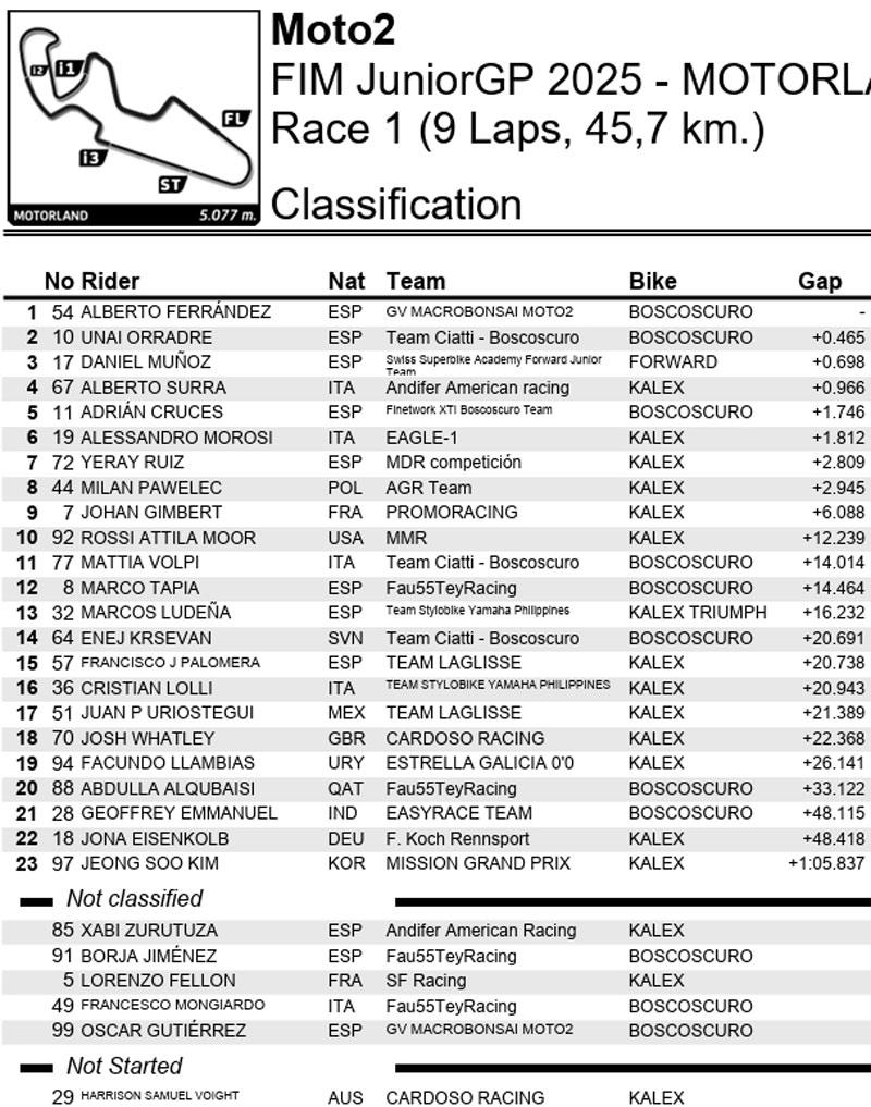 La première course du Championnat d’Europe Moto2™ a offert son lot de rebondissements et une course finalement réduite à 9 tours. Parti de la pole, Alberto Surra (Andifer American Racing) a vu son coéquipier Xabi Zurutuza s’échapper en tête, avant que ce dernier ne soit contraint à l’abandon à cause d’un problème de carénage. Alberto Ferrandez (GV Racing Moto2) et Unai Orradre (Team Ciatti – Boscoscuro) se sont alors disputé la victoire jusqu’au dernier tour, et c’est finalement Alberto Ferrandez qui l’a emporté, réduisant l’écart au championnat. Dani Muñoz (Swiss Superbike Academy Forward Junior), auteur d’une superbe remontée depuis la 10ᵉ place, décroche son premier podium de la saison.