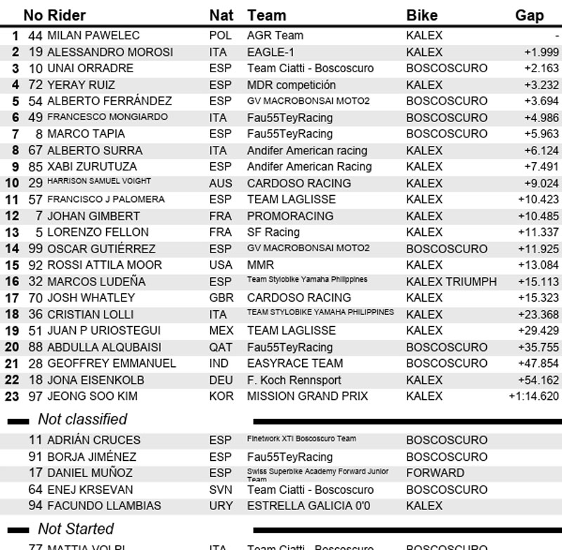 Lors de la seconde course, elle aussi réduite à 9 tours, Milan Pawelec (AGR Team) a frappé fort dans les derniers tours pour décrocher sa première victoire en Moto2™ ECh. Le pilote polonais a dépassé Orradre dans les ultimes instants pour s’imposer. La lutte pour la deuxième place s’est jouée dans le dernier virage, où Alessandro Morosi (Eagle-1) a sorti un dépassement magistral sur Orradre, contraint de se contenter de la troisième place. Avant la manche de Misano, Orradre conserve tout de même 14 points d’avance au classement.