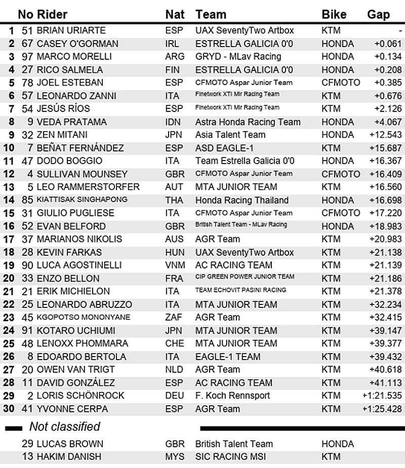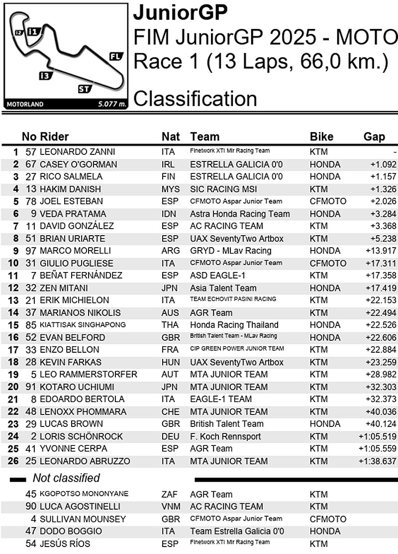 En JuniorGP™, lors de la première course Leonardo Zanni (Finetwork XTI Mir Racing Team) a remporté son premier podium et sa toute première victoire après une remontée exceptionnelle en fin de course. Après plusieurs occasions manquées lors des manches précédentes, le pilote italien n’a cette fois pas tremblé : le n°57 s’est imposé face à Casey O’Gorman et Rico Salmela, les deux pilotes du team Estrella Galicia 0’0, qui complètent le podium.