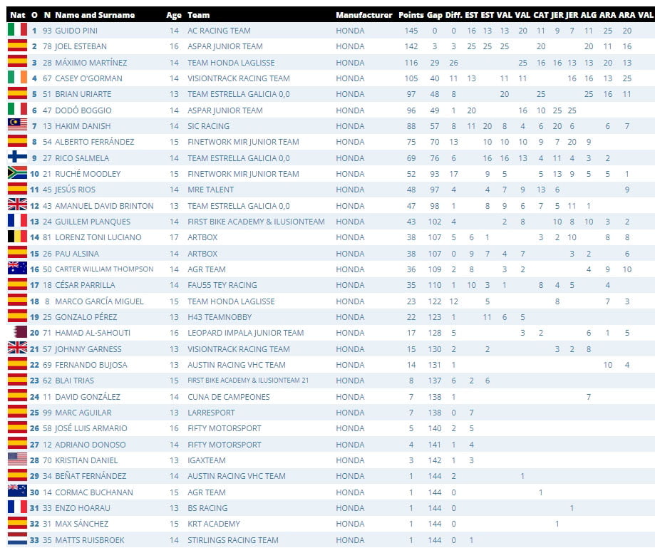 L’autre titre qui aurait pu être remporté lors de l’avant-dernière manche était le Hawkers ETC, mais cette bataille se dirige vers Valence. Guido Pini s’est imposé pour la première fois en 2022 dans la Course 1 après avoir devancé Máximo Martínez (Team Honda Laglisse) dans le dernier virage, tandis que Brian Uriarte (Team Estrella Galicia 0,0) est monté sur la dernière marche du podium dans la rencontre sous drapeau rouge. Dans la course 2, un fascinant duel de cinq pilotes s’est déroulé et une fois encore, tout s’est joué dans le dernier tour. Cette fois, Casey O’Gorman a remporté la course jusqu’à la ligne avec seulement 0,008s d’avance pour décrocher sa première victoire au Hawkers ETC, tandis que l’Irlandais s’est débarrassé de Guido Pini en P2 et de Joel Esteban (Aspar Junior Team) en P3. Avant la dernière course de la saison, Guido Pini mène la course au titre avec trois points d’avance sur Joel Esteban.