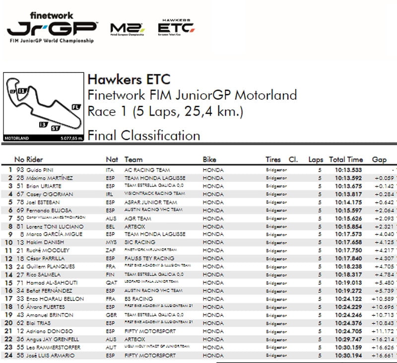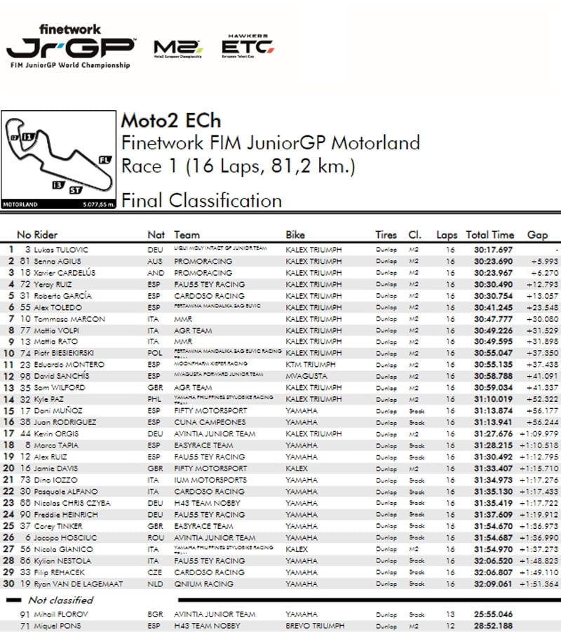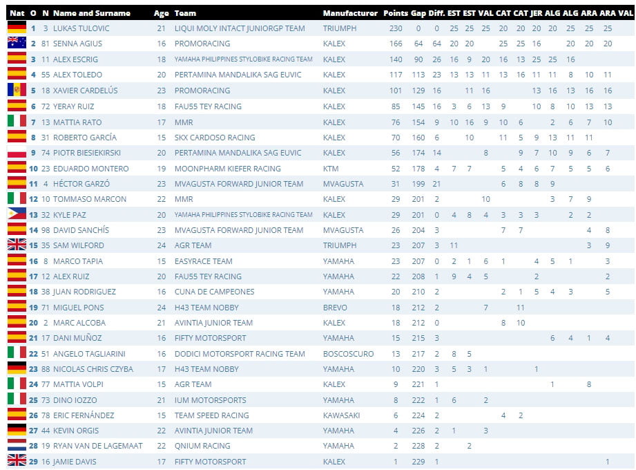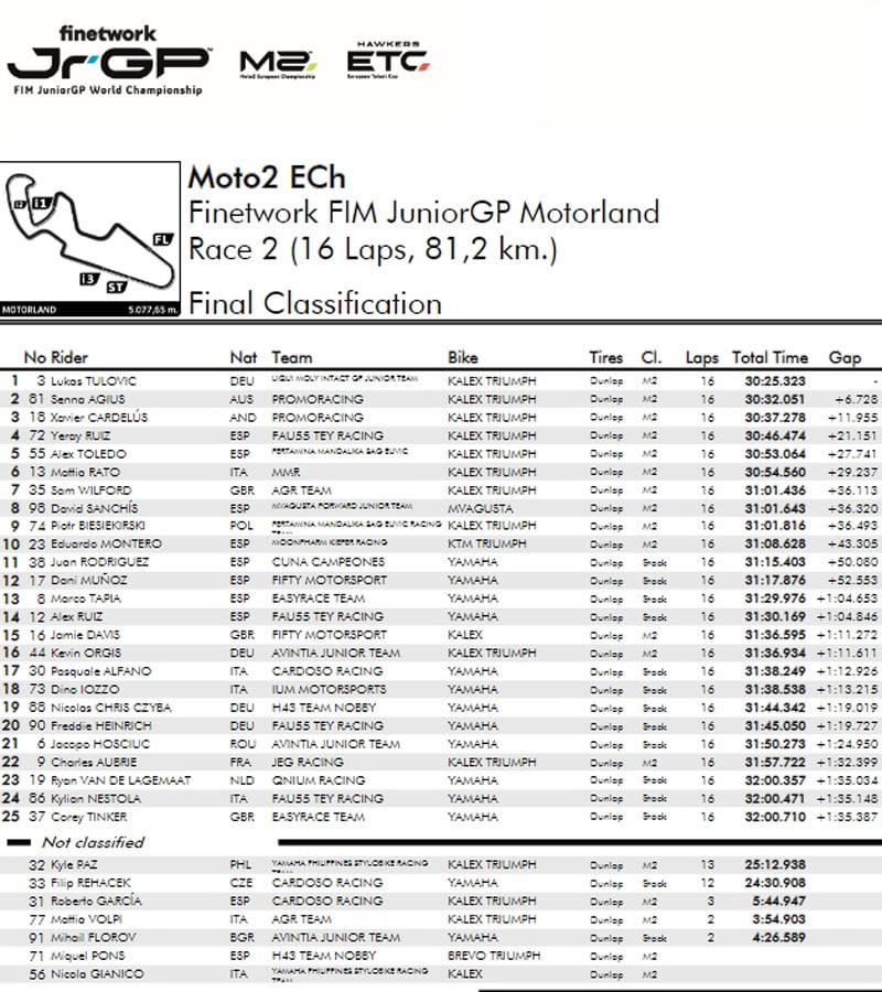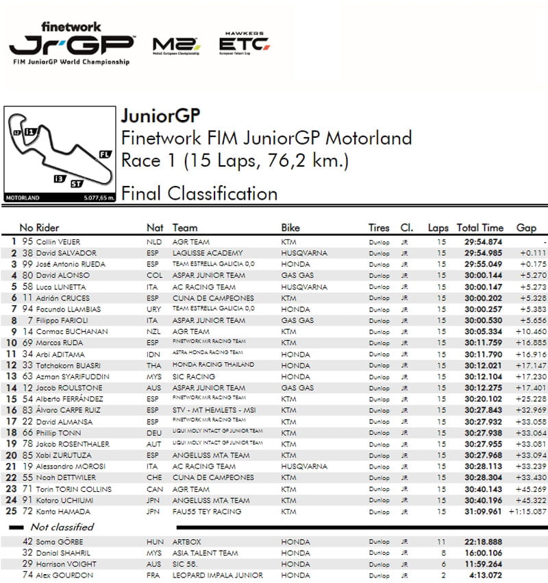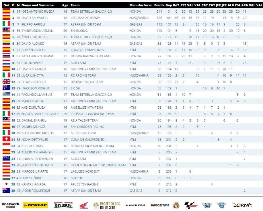 Dans la seule course JuniorGP™ de la journée, Colin Viejer a tenu tête à David Salvador (Laglisse Academy) et au champion en titre José Antonio Rueda (Team Estrella Galicia 0,0) pour remporter sa deuxième victoire de la saison. La deuxième place de Salvador est son meilleur résultat de l’année et l’Espagnol renforce son emprise sur la deuxième place du classement général, tandis que Rueda a conservé sa phénoménale série de neuf podiums en 10 courses avec une troisième place.