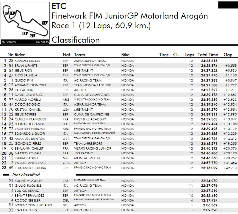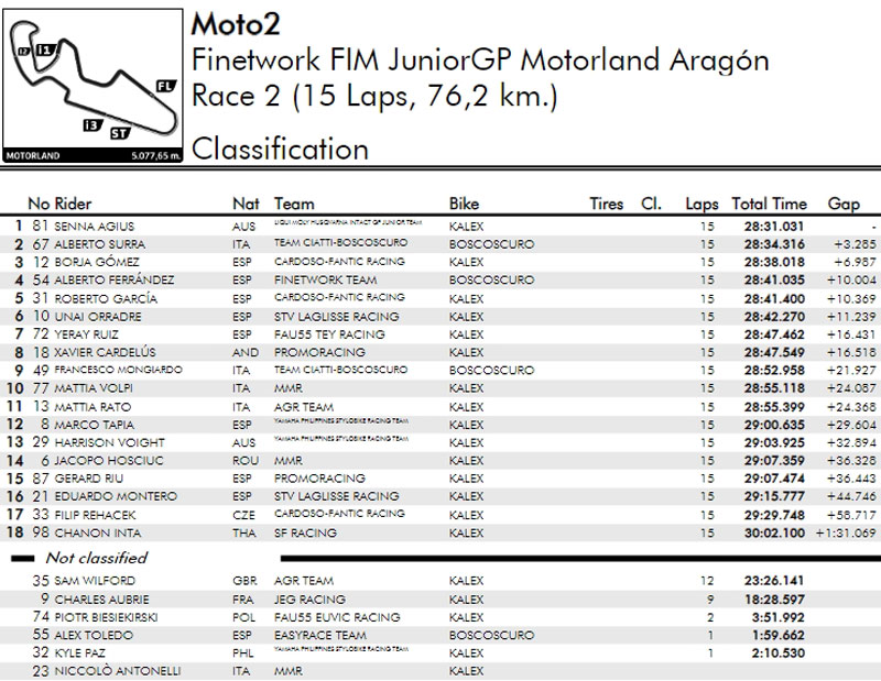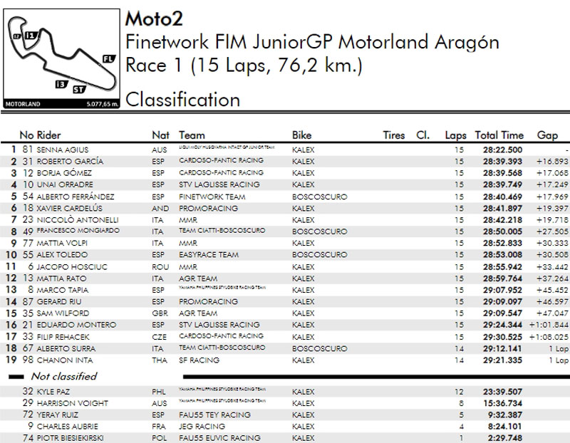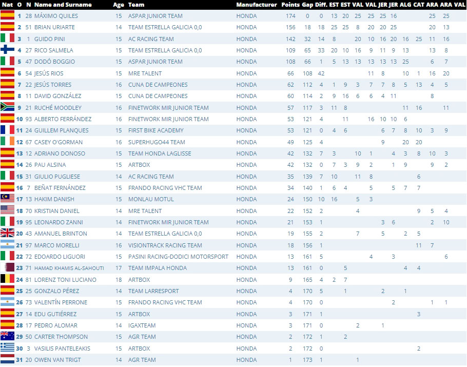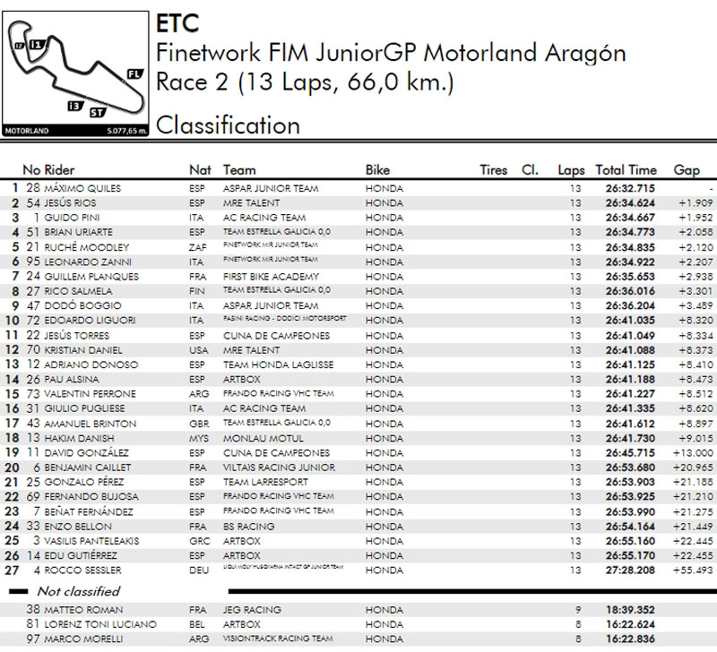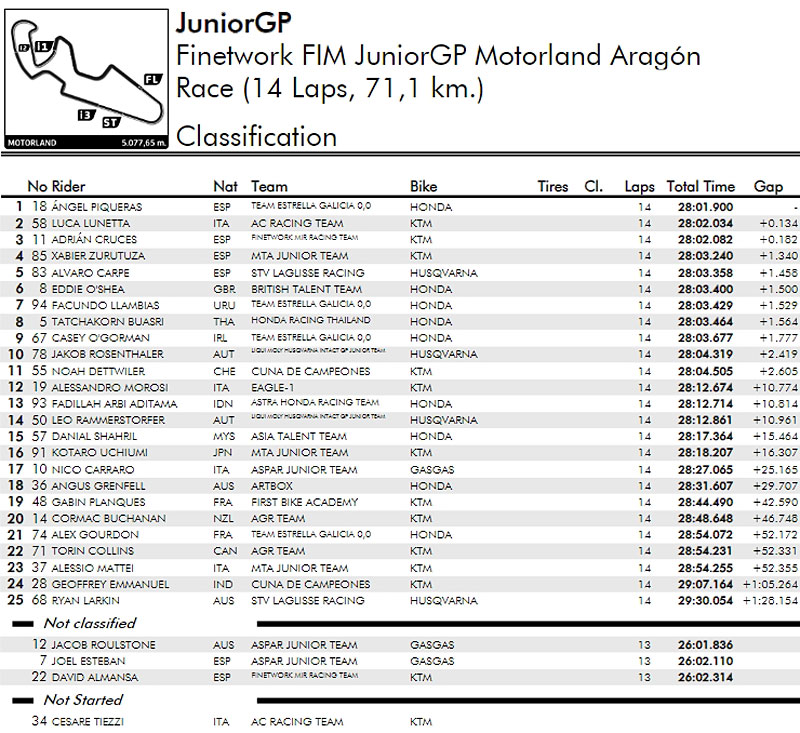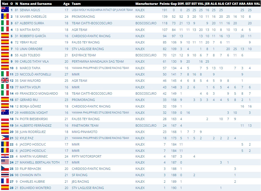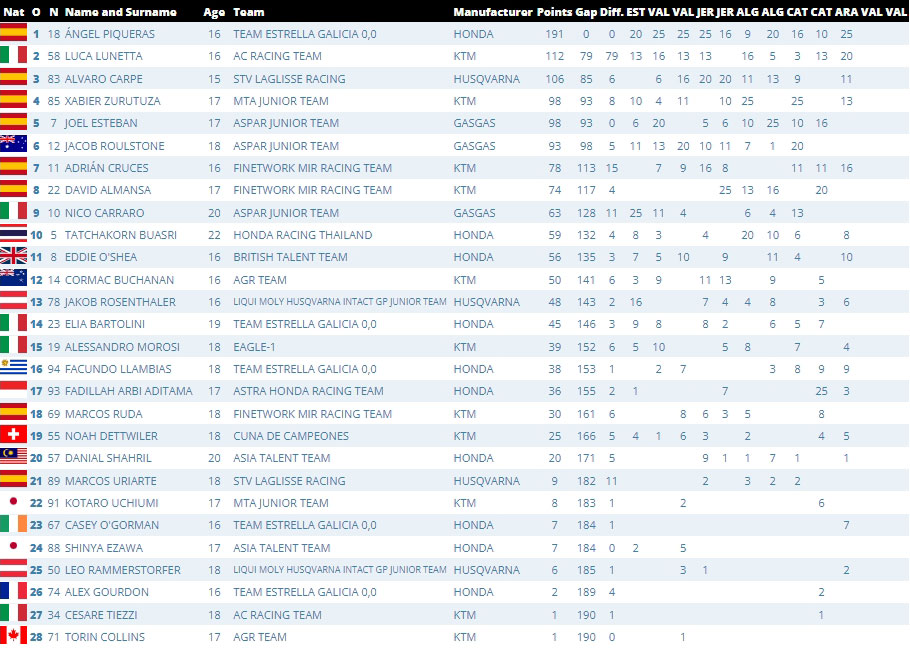 Angel Piqueras remporte la victoire et donc le titre, le Valencien tenant tête à Lunetta jusqu’à la ligne d’arrivée, tandis qu’Adrian Cruces (Finetwork Mir Racing Team) complète le podium. Avec un double rendez-vous à Valence, la bataille pour la deuxième place du classement est imprévisible.