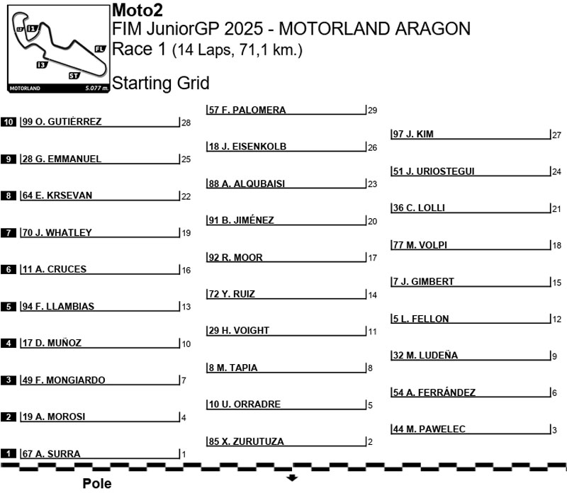En JuniorGP, Brian Uriarte (UAX SeventyTwo Artbox) a ainsi décroché sa troisième pole position de la saison, en roulant en 1’56 »886, devançant Jesus Rios (Finetwork Mir Racing Team) et Rico Salmela (Estrella Galicia 0,0) pour prendre la tête de la grille.