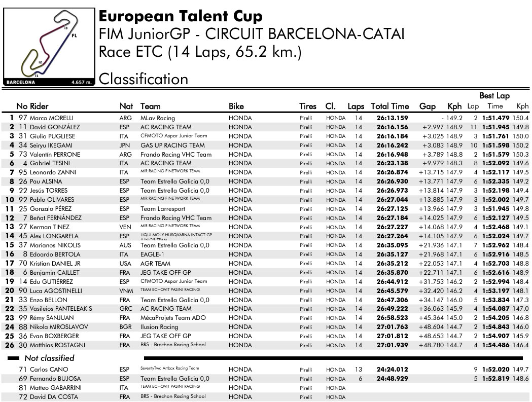 Dans la catégorie du Championnat du Monde FIM JuniorGP™, Jesus Rios (MRE Talent) et Alvaro Carpe (STV Laglisse Racing) ont remporté les honneurs, tandis que Dani Muñoz (Gas Up Racing Team) a fait le doublé en Championnat d’Europe Moto2™. Dans l’European Talent Cup, Marco Morelli a continué à montrer quel futur talent il est en s’imposant lors de l’unique course.