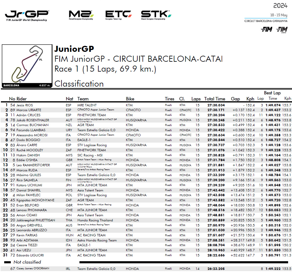 Le #54 a été rejoint sur le podium par Marcos Uriarte (CFMoto Aspar Junior Team) et le poleman Adrian Cruces (Finetwork Team), mais seulement après que Eddie O’Shea (British Talent Team – Mlav Racing) ait été privé d’une victoire en fin de course.