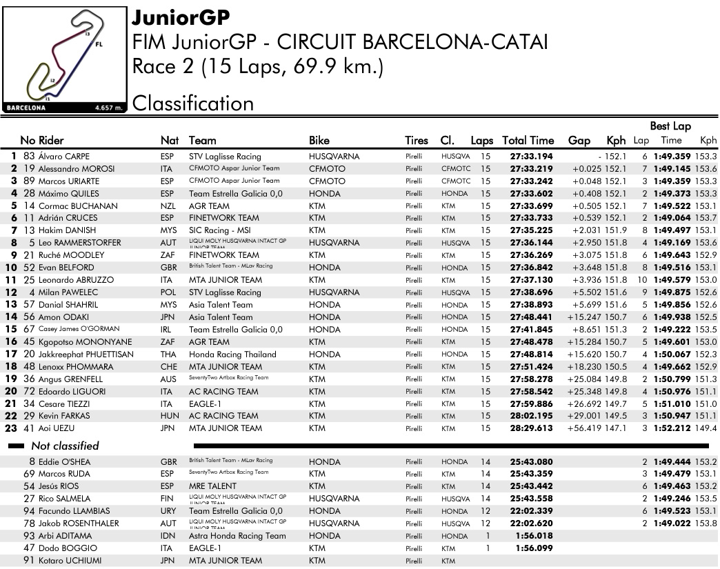 Dans la course 2, Alvaro Carpe a surpris les deux pilotes du CFMoto Aspar, Uriarte et Morosi, sur la ligne de départ. Parti en 12ème position sur la grille de départ, le n°83 a attendu son heure alors que la tête de course changeait de mains à plusieurs reprises. Un large groupe s’est disputé les honneurs, avec une chute d’Eddie O’Shea dans le dernier tour qui a empêché le Britannique de s’imposer une nouvelle fois, puis un incident séparé, qui a vu le vainqueur de la course 1, Jesus Rios, tomber avec Marcos Ruda (SeventyTwo Artbox Racing Team) et Rico Salmela (Liqui Moly Husqvarna Intact JuniorGP Team), a causé des ravages dans le groupe de chasse.