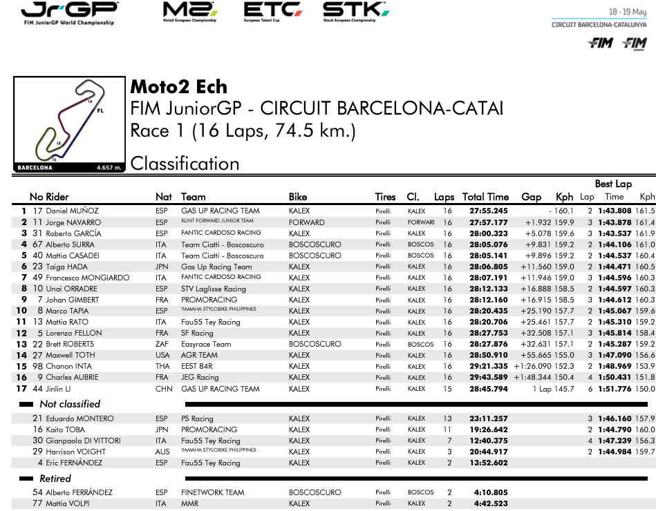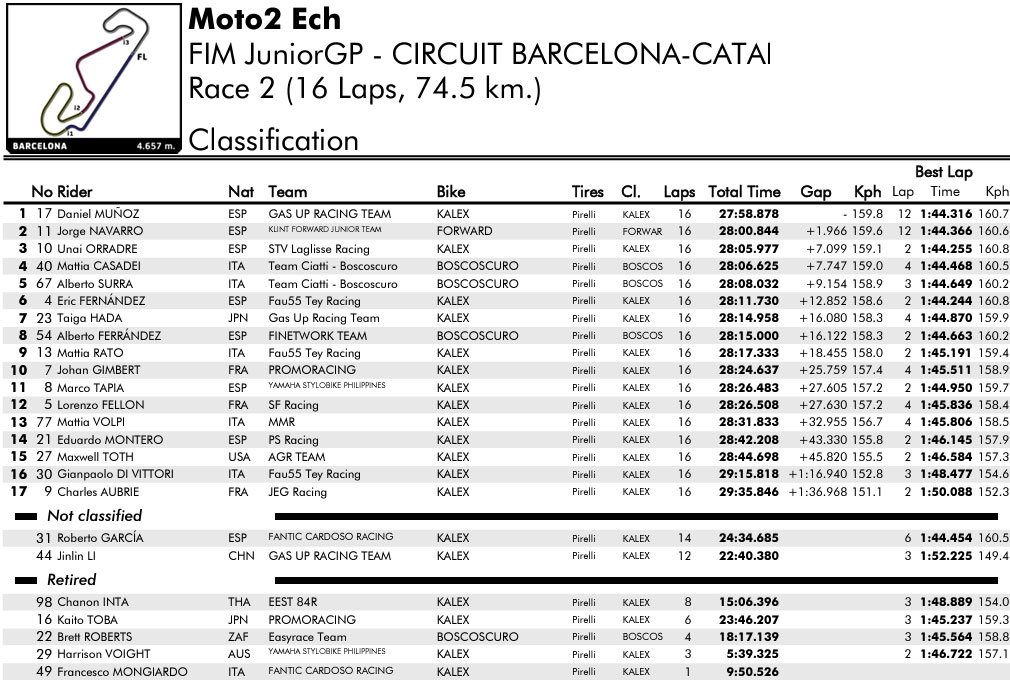 Plus tard dans l’après-midi, les Moto2 reprenaient la piste et Dani Muñoz réalisait le doublé. La deuxième course de la journée a suivi un scénario similaire, avec Casadei en difficulté au départ et Muñoz, Navarro et Garcia s’échappant, mais cette fois rejoints par Eric Fernandez (FAU55 TEY Racing) et Surra.