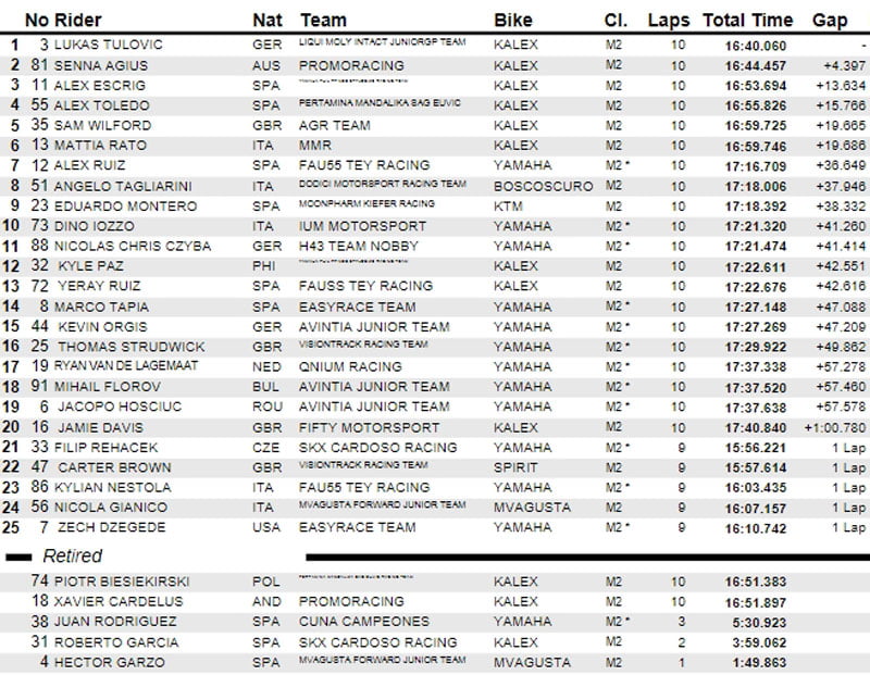 Ce fut une journée chargée pour le Moto2™ ECh, avec les deux courses perturbées par des drapeaux rouges. Dans la course 1, le drapeau rouge a été agité pour Tommaso Marcon (MMR), qui est entré en collision avec Roberto Garcia (SKX Cardoso Racing) à l’entrée du virage 1 dans le premier tour. Au redémarrage, Lukas Tulovic s’est détaché de Senna Agius (Promoracing), avant que le drapeau rouge ne soit à nouveau agité lors de la reprise des 12 tours. Cette fois, pour une chute impliquant Piotr Biesiekirski (Pertamina Mandalika SAG Euvic Racing Team) et Xavi Cardelus (Promoracing). Le podium a donc vu Lukas Tulovic remporter sa première victoire devant Senna Agius et Alex Escrig (Yamaha Philippines Stylobike Racing Team), ces deux derniers montant sur leur premier podium dans la catégorie.