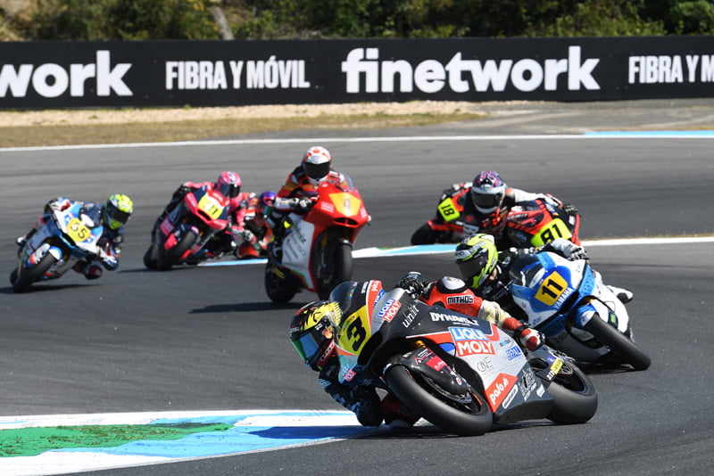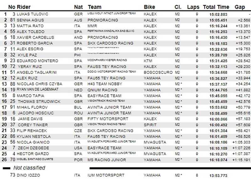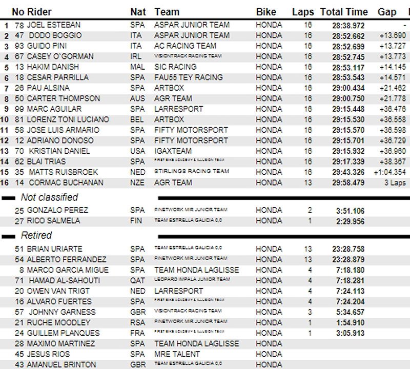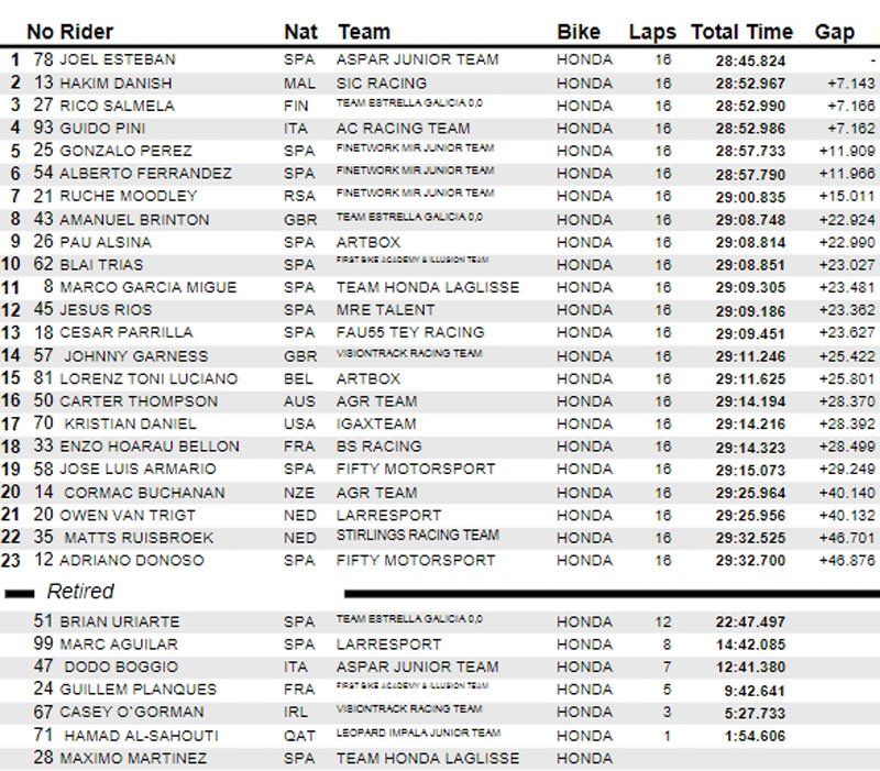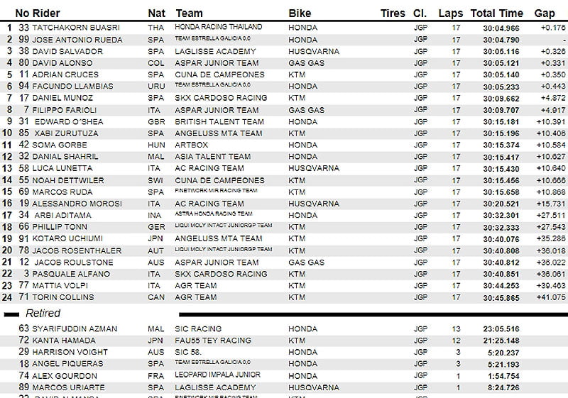 Cependant, l’Espagnol était privé de la première victoire de sa carrière en étant rétrogradé d’une place pour avoir dépassé les limites de la piste dans le dernier tour, donnant ainsi la victoire à Buasri. David Salvador (Laglisse Academy) complète le podium, devançant David Alonso (Aspar Junior Team) de 0.005s. Les rookies Adrian Cruces (Cuna de Campeones) et Facundo Llambias (Team Estrella Galicia 0,0), qui étaient dans le groupe de tête, complètent le top six.