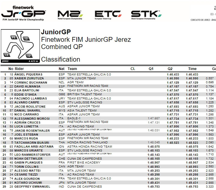 Côté français, c’est difficile pour Elliot Kassigan (Mecaprojets Team Ado), Léandro Quintans (Team Larresport), Benjamin Caillet (Viltaïs Racing Junior) et Matthias Rostagni (MB38 by Mecasport) qui devront participer à la Last Chance Race, à priori sans grandes chances de se qualifier. A l’inverse, Guillem Planques (First Bike Academy) et Enzo Bellon (MB38 by Mecasport) sont assurés de participer à la course.