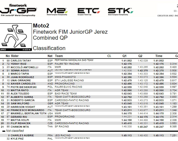 De nouveaux polemen, de la régularité et des bouleversements possibles pour dimanche ! Les pole positions sont décidées, Ángel Piqueras (Team Estrella Galicia 0,0) réglant l’affaire dans le Championnat du Monde Finetwork FIM JuniorGP™. En Championnat d’Europe Moto2™, Carlos Tatay (Pertamina Mandalika SAG Team) a décroché sa première pole de la saison. Máximo Quiles (Aspar Junior Team) a enchaîné deux poles consécutives en European Talent Cup.