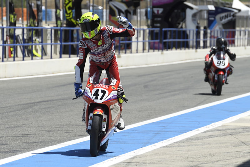 L’unique rencontre de la catégorie Moto2™ ECh a également été intéressante et n’a été réglée que dans les derniers instants ; une lutte à quatre avec Alex Escrig prenant le holeshot devant Xavi Cardelus (Promoracing), son coéquipier Senna Agius et Lukas Tulovic (Liqui Moly Intact GP Junior Team) s’est rapidement déroulée et s’est décidée en fonction de la meilleure gestion des pneus. Après des erreurs, Lukas Tulovic était de retour en quatrième position, mais il s’est vite battu pour revenir en deuxième position devant Senna Agius et Xavi Cardelus, mais personne n’a pu rattraper Alex Escrig, qui est devenu le 32ème vainqueur différent en Moto2™ ECh, décrochant ainsi sa première victoire. Un drame s’est produit en fin de course lorsque Mattia Rato (MMR) a éliminé son coéquipier Tommaso Marcon dans le dernier virage du dernier tour.