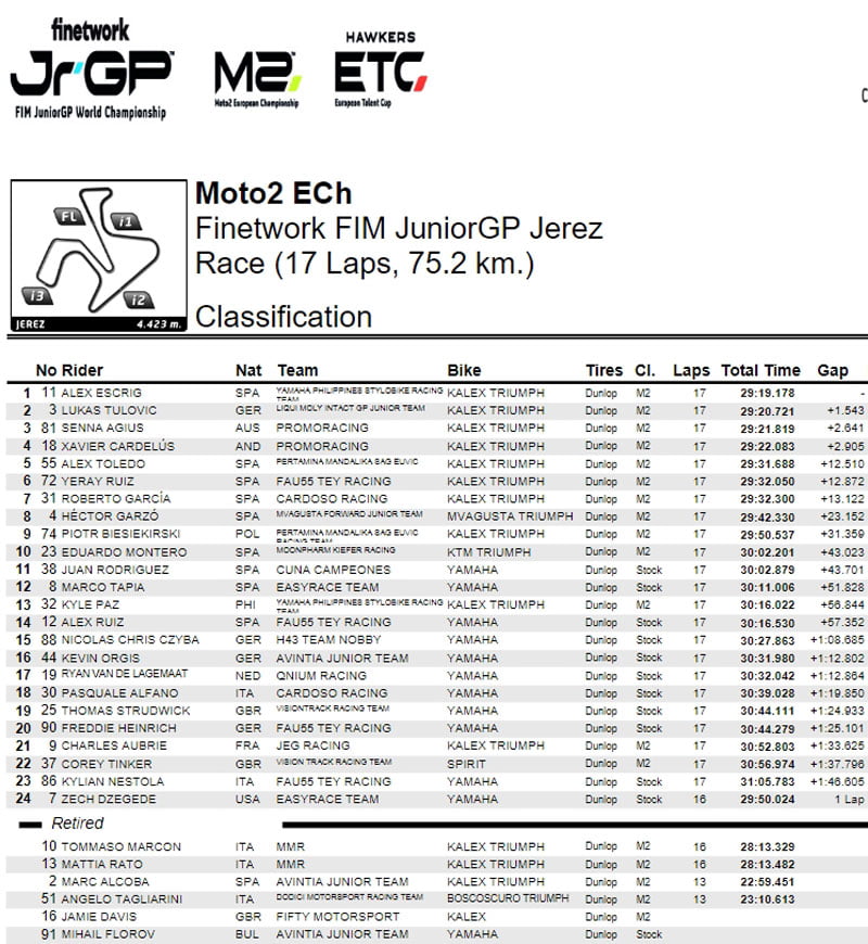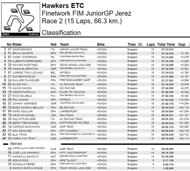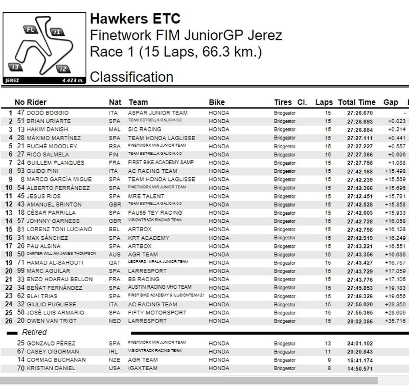 Guido Pini (AC Racing Team), qui cherchait à profiter de l’absence de Joel Esteban (Aspar Junior Team) pour prendre la tête du classement, n’a pas pu le faire et n’a terminé que huitième.