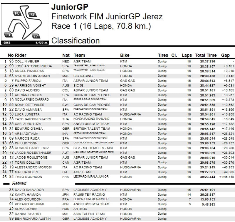 Les JuniorGP™ ont démarré sous une matinée nuageuse à Jerez, mais les températures fraîches ont donné une course palpitante. Une bataille entre Collin Veijer, José Antonio Rueda, Ángel Piqueras (Team Estrella Galicia 0,0), Syarifuddin Azman (SIC Racing) et David Salvador (Laglisse Academy) a rapidement démarré, avec de l’imprévisibilité partout. Dans les derniers instants, c’est Collin Veijer qui, après avoir été continuellement fort dans les troisième et quatrième secteurs, a pris les devants dans le dernier tour, tandis que David Salvador a chuté au virage 11, le poursuivant. José Antonio Rueda n’a pas pu passer et c’est Collin Veijer qui a remporté sa première victoire dans cette catégorie, une première également pour les Pays-Bas.