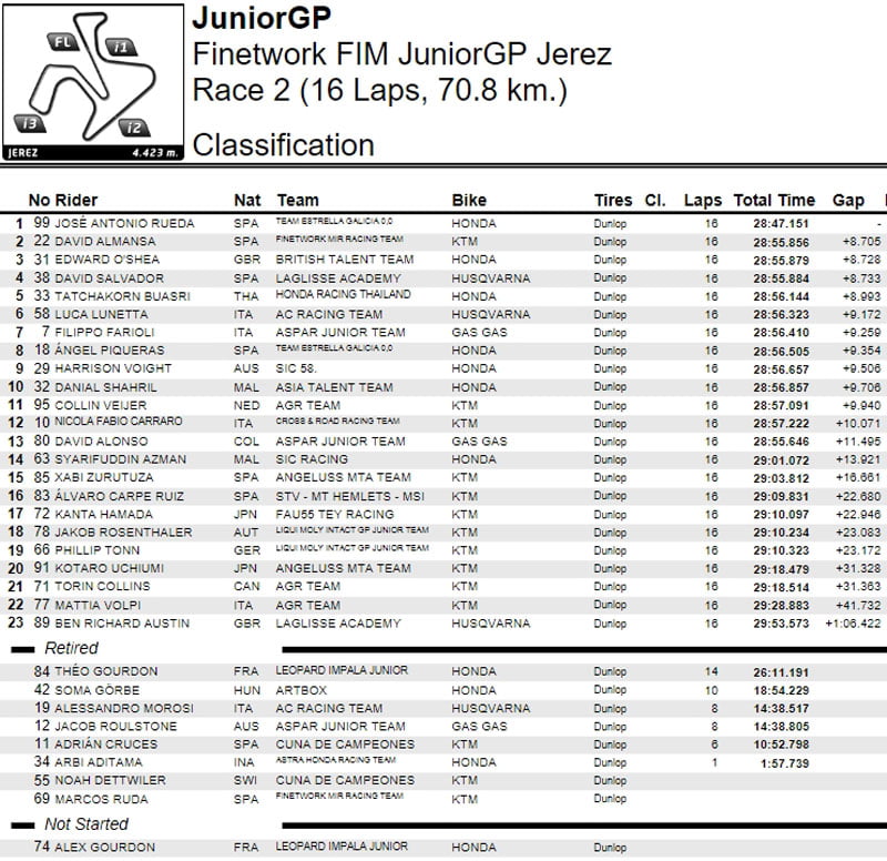 La deuxième course a lieu dans l’après-midi, et José Antonio Rueda a réalisé une performance remarquable malgré des températures plus chaudes, en s’échappant pour gagner avec plus de huit secondes d’avance. Cependant, la course a tout de même été intéressante puisque la bataille pour la deuxième place a vu plus de dix coureurs se disputer le podium. David Alonso (Aspar Junior Team) a rebondi après une course 1 légèrement décevante pour franchir la ligne d’arrivée en deuxième position dans la course 2, devant David Almansa (Finetwork Mir Racing Team) et Eddie O’Shea (British Talent Team), qui était quatrième. Cependant, le podium a ensuite fait l’objet d’une enquête et, pour avoir dépassé les limites de la piste, David Alonso a été rétrogradé à la quatrième place, ce qui a permis à David Almansa et Eddie O’Shea de monter sur leur premier podium. A noter que Eddie O’Shea est parti de la cinquième ligne de la grille et a rattrapé plus de cinq secondes aux pilotes qui le précédaient.