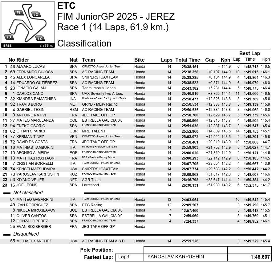 Comme à son habitude, l’European Talent Cup a offert deux courses instantanément classiques pour la catégorie. La course 1 a vu le rookie Alvaro Lucas (CFMoto Aspar Junior Team) remporter sa toute première victoire après une bataille passionnante avec Fernando Bujosa (AC Racing Team) et Alex Longarela (Snipers IGAXTeam). Le trio est resté à l’écart d’un incident dramatique en fin de course impliquant le champion en titre Carlos Cano (UAX SeventyTwo Artbox) et Yaroslav Karpushin (Frando Racing VHC Team). Cano a réussi à remonter pour terminer sixième, tandis que Karpushin a chuté et s’est vu refuser son premier podium.