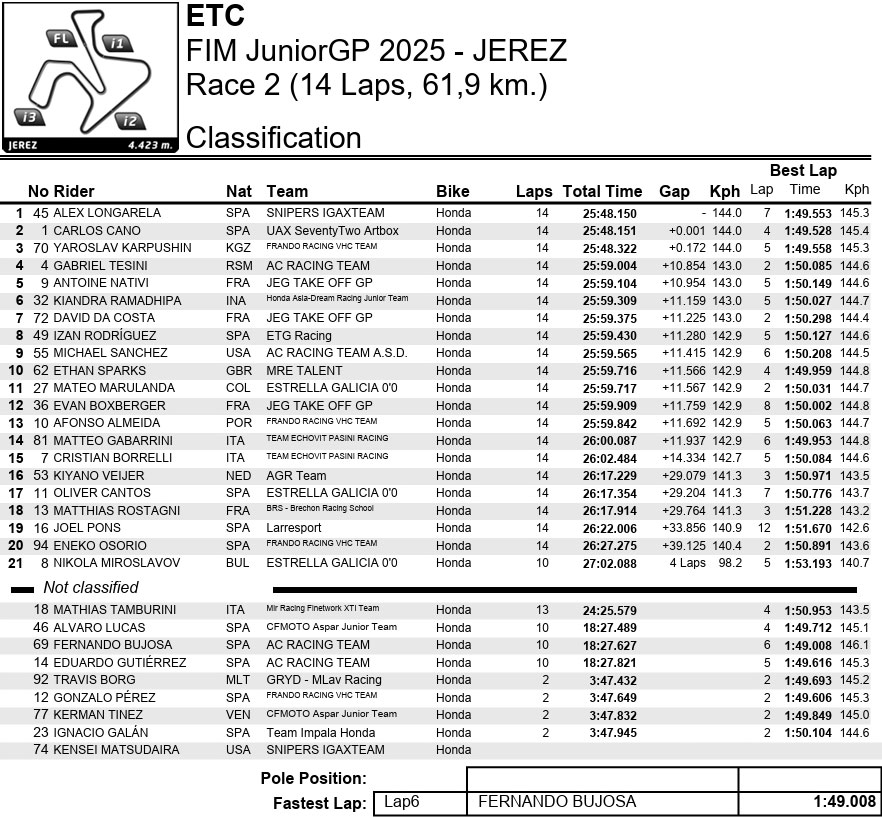 Pendant ce temps, Bujosa, Lucas et Eduardo Gutierrez (AC Racing Team) ont tous abandonné le groupe de tête dans un incident spectaculaire en milieu de course. Tous trois auront à cœur de rebondir à Magny-Cours, où le peloton de poursuivants cherchera à rattraper le nouveau leader du championnat, Longarela.