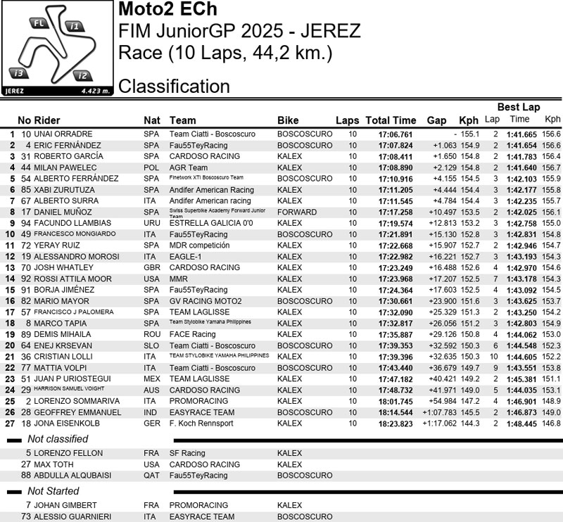 Dans la seule course du Moto2™ ECh, Unai Orradre (Team Ciatti-Boscoscuro) a montré toute sa force en remportant la victoire dans une course qui a dû être relancée. Après seulement deux tours, la course a été interrompue par un drapeau rouge en raison des conditions de la piste, offrant un répit à Eric Fernandez (FAU55 TEY Racing Team) et Orradre après leur collision au départ. La deuxième fois, il n’y a pas eu de drame et Orradre a immédiatement trouvé son rythme pour décrocher son troisième podium consécutif et sa deuxième victoire de la saison. Fernandez est remonté sur le podium en deuxième position, tandis que le champion en titre Roberto Garcia (Cardoso Racing) a décroché la troisième place, privant le poleman Milan Pawelec (AGR Team) de sa toute première visite au Parc Fermé.
