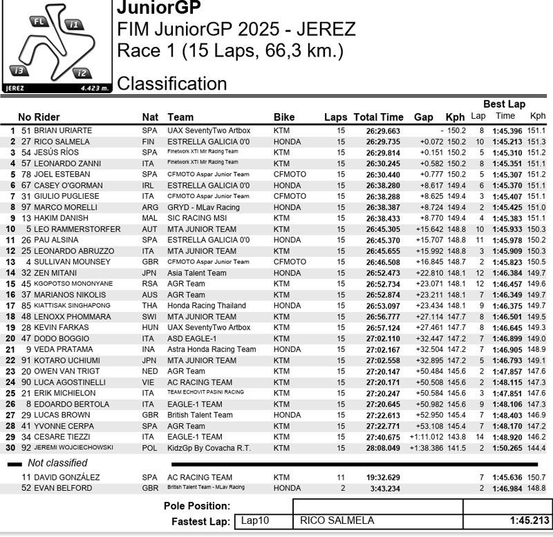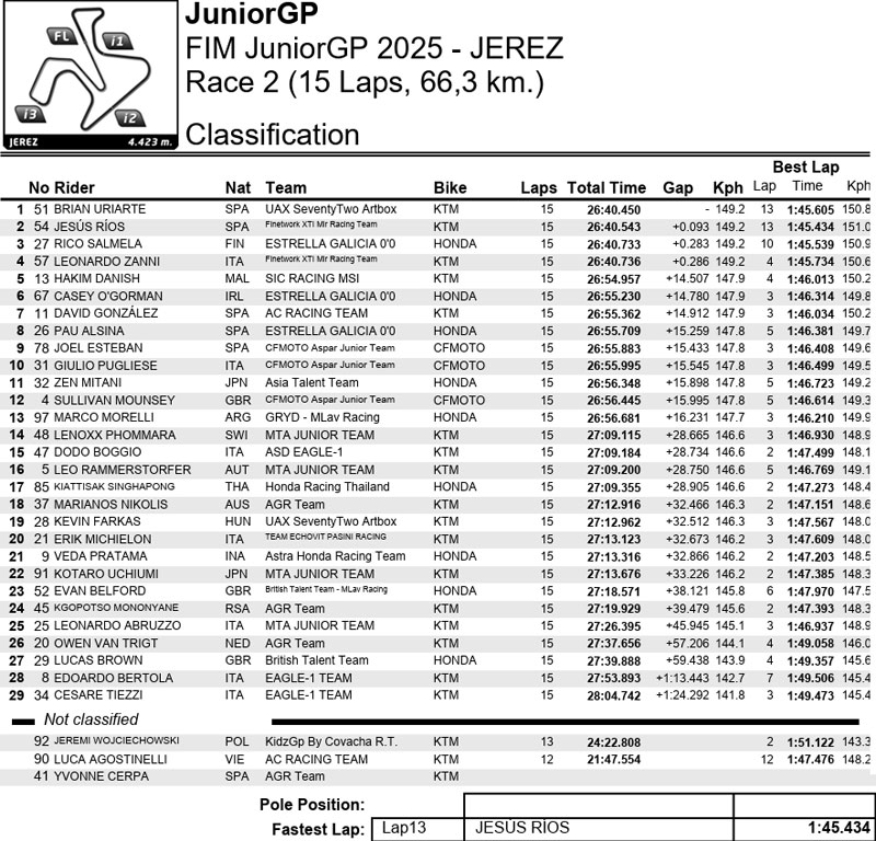 La course 2 a été tout aussi spectaculaire, le même quatuor se disputant la tête tout au long de la course. Une fois de plus, tout s’est joué dans les derniers instants : Rios a poussé Uriarte jusqu’au bout, mais le n° 51 a tenu bon pour remporter la victoire. Salmela a pris la troisième place au photo-finish, tandis que Zanni, malchanceux, a de nouveau manqué le podium pour 3 millièmes de seconde malgré une autre course exceptionnelle !