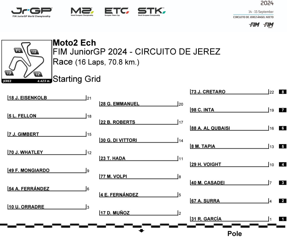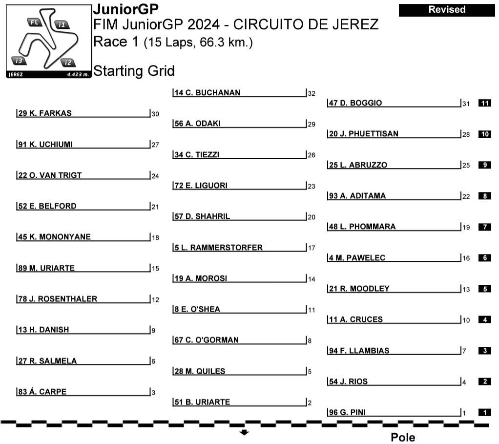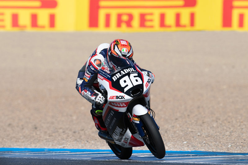 Dans le JuniorGP™, c’est l’Italien Guido Pini (SeventyTwo Artbox Racing Team) qui a décroché la pole position grâce à un sensationnel tour en solo lors des qualifications. L’Italien a démontré sa confiance en s’écartant du peloton, poursuivant seul l’attaque du meilleur chrono à Jerez.
