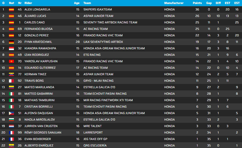 Sans podium lors de la première manche, mais avec deux quatrièmes places, Alvaro Lucas (Aspar Junior Team) occupe la deuxième place du classement général pour sa première année en ETC, tandis que Cano est à égalité avec Bujosa en troisième position avec 25 points, tous deux ayant remporté des victoires et subi des abandons. Double vainqueur à Jerez l’année dernière, le n° 1 sera à nouveau favori.