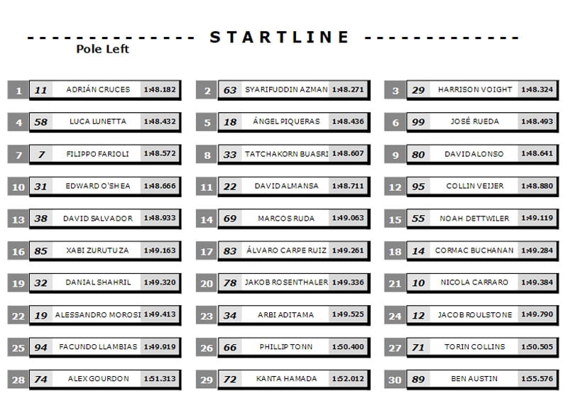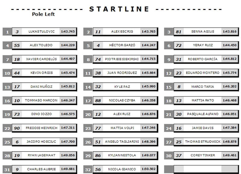 En tête de la deuxième ligne de la grille, Luca Lunetta (AC Racing Team) manque de peu une place en première ligne. Bien que des tours aient été annulés pendant la Q2, l’Italien a obtenu sa première deuxième ligne de l’année en 4ème position. Ángel Piqueras (Team Estrella Galicia 0,0) se retrouve au milieu de la deuxième ligne en 5ème position après avoir réalisé un temps à seulement 0.004s de Lunetta. La deuxième ligne est complétée par l’homme à battre José Antonio Rueda (Team Estrella Galicia 0,0), qui se retrouve en première ligne pour la première fois de la saison. Le leader du championnat avait un record de qualification presque parfait avant le week-end, et a démarré chaque course dans le top 2. L’Espagnol aura fort à faire dans la course de dimanche, alors que tout le peloton se prépare à la bataille.