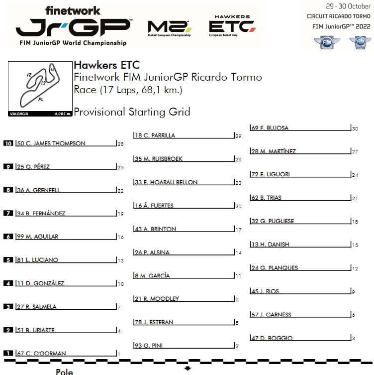 L’Italien Luca Lunetta (AC Racing Team) a été très impressionnant en prenant une quatrième place bien méritée, après avoir été en première ligne sur le circuit Ricardo Tormo plus tôt dans l’année. Avec de bons résultats dans le top sept des quatre dernières courses et une cinquième place, le pilote Husqvarna vise un premier podium en 2022. La cinquième place revient à la star colombienne David Alonso (Aspar Junior Team). Le pilote GASGAS tentera de réitérer sa victoire à Valence en 2022. La deuxième ligne est complétée par David Salvador (Laglisse Academy), sixième, qui espère terminer 2022 avec une première victoire en JuniorGP™ avant de passer au Championnat du Monde Moto3™ en 2023. Partant sixième de la Course 1 en raison de pénalités devant lui, Alberto Ferrández (Finetwork Mir Racing Team).