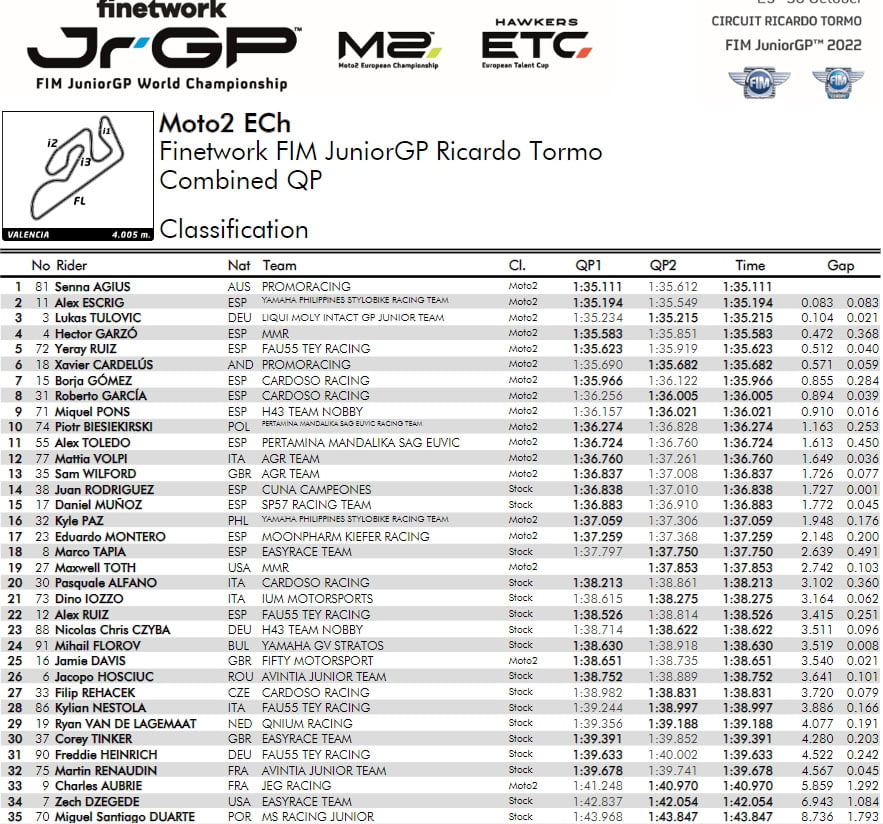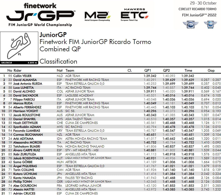 Dans des conditions météorologiques parfaites, samedi au Circuit Ricardo Tormo de Valence, les qualifications des trois catégories du Championnat du Monde Finetwork FIM JuniorGP™ 2022 ont donné lieu à des actions tendues, de nouveaux records, deux nouveaux polemen et une pluie de sanctions.