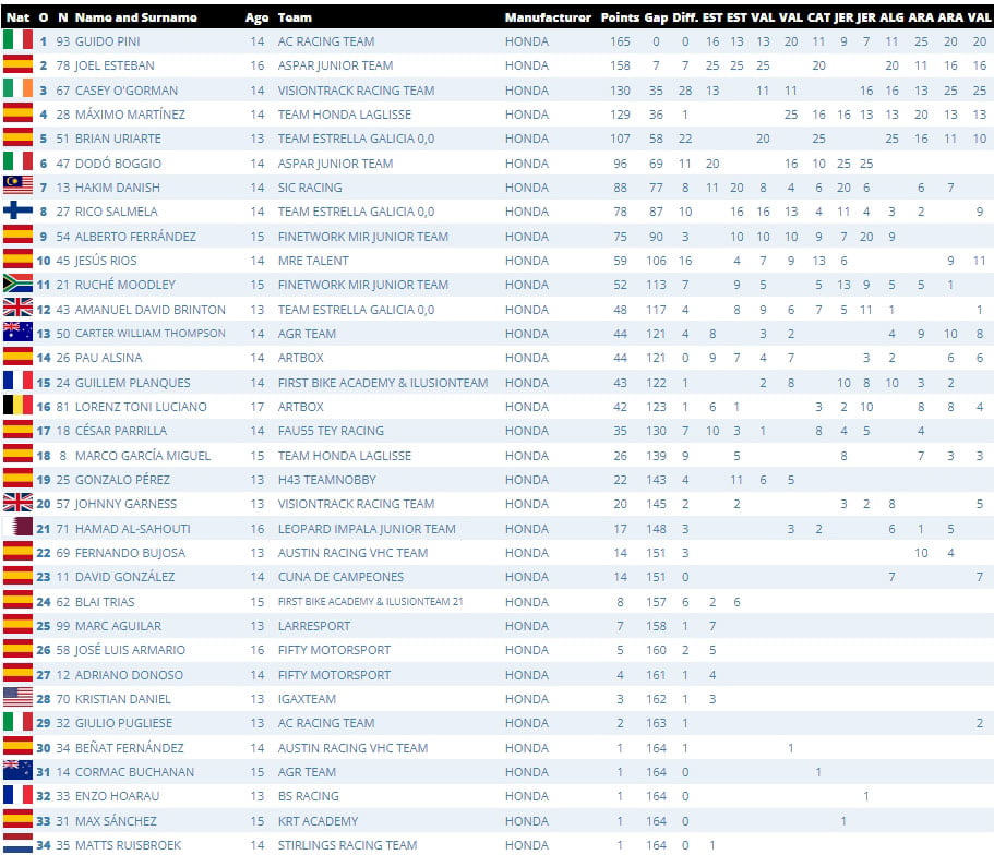 Cela a en effet été une journée intense dans la Hawkers ETC, où l’histoire s’est écrite une fois de plus dans le dernier tour. Avec seulement trois points d’écart, Guido Pini (AC Racing Team) est parti en deuxième position, tandis qu’avec trois points de retard dans la course au titre, Joel Esteban (Aspar Junior Team) est parti de la cinquième place. Pendant toute la durée de la course, les deux hommes se sont battus dans le groupe de tête, où se sont affrontés le poleman Casey O’Gorman (VisionTrack Racing Team), le champion sortant Máximo Martínez (Team Honda Laglisse), Jésus Rios (MRE Talent), Brian Uriarte (Team Estrella Galicia 0,0) et son coéquipier Rico Salmela. Cependant, avec un dépassement décisif vers la fin, Guido Pini s’est placé dans une position parfaite et a décroché la couronne avec une P2 derrière Casey O’Gorman, tandis qu’un Joel Esteban, déçu, a été troisième, manquant le titre de sept points.