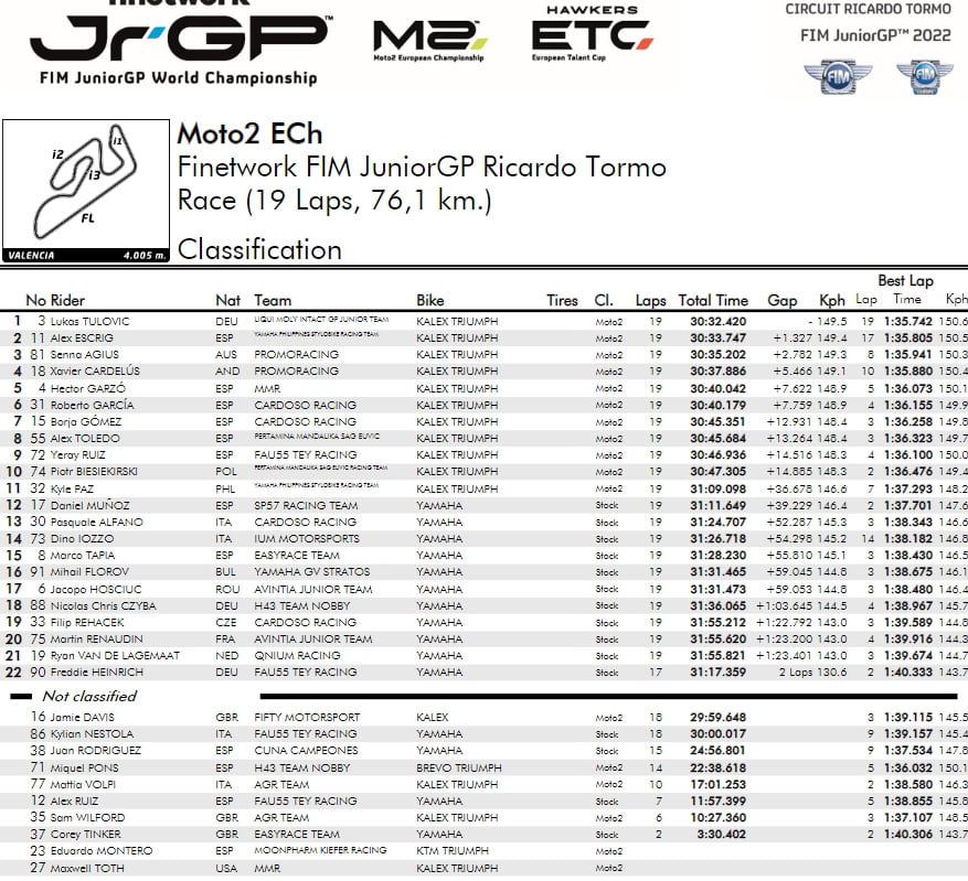 Dans la catégorie Moto2™ ECh, Lukas Tulovic (Liqui Moly Intact GP Junior Team) a réalisé une belle performance ; le pilote allemand, déjà sacré champion et promis au championnat du monde Moto2™ en 2023, a dû partir de la troisième place sur la grille mais dès le départ, il a chuté à la cinquième place. Il s’est rapidement débarrassé de Yeray Ruiz (FAU55 TEY Racing) et Roberto Garcia (Cardoso Racing) pour prendre la troisième place, avant de se placer derrière Senna Agius (Promoracing) et Alex Escrig (Yamaha Philippines Stylobike Racing Team). Tulovic les a devancés dans les six derniers tours, Alex Escrig poursuivant Tulovic une fois qu’il a dépassé Senna Agius, mais sans succès, l’Allemand remportant sa septième victoire en 2022, terminant dans les deux premiers à chaque course tout au long d’une campagne de championnat mémorable. Derrière lui dans le classement, Senna Agius a fièrement terminé deuxième pour l’Australie, tandis que le pilote espagnol Alex Escrig a pris la troisième place.