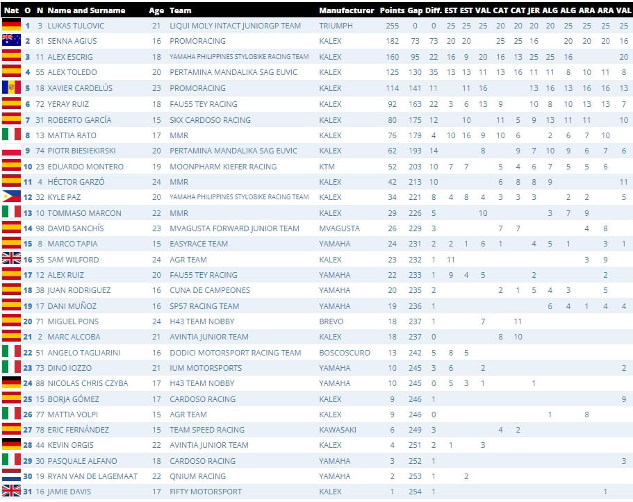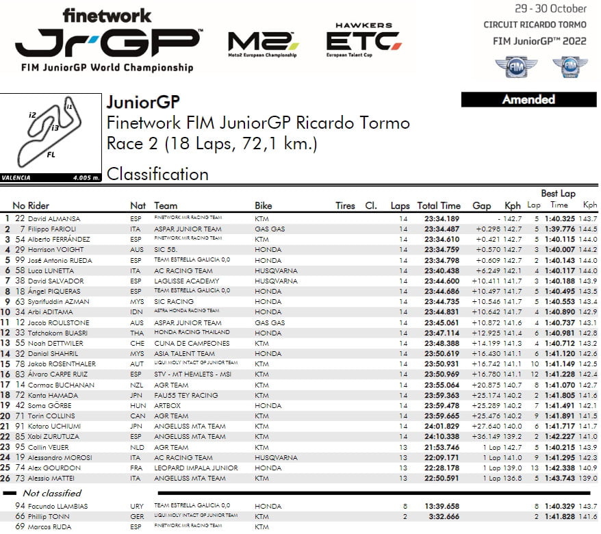La course 2 a également été intense dès le départ avec une bataille entre Collin Veijer et José Antonio Rueda, y compris une collision en début de course au virage 3, bien que tous deux soient restés debout. Luca Lunetta (AC Racing Team) était dans le coup dès le départ, ainsi que les visages familiers de Filippo Farioli, David Almansa, Harrison Voight et Alberto Ferrández (Finetwork Mir Racing Team) dans une lutte à sept en tête. Il y a eu un grand drame dans le dernier tiers de la course lorsque Luca Lunetta et Collin Veijer sont entrés en collision à la sortie du virage 1 dans une convergence de trajectoires, laissant Collin Veijer au sol. Cependant, deux tours plus tard, une fuite d’huile d’un coureur en aval a rendu le virage 2 glissant et a fait sortir plusieurs coureurs, dont le leader de la course, David Almansa. Cependant, un drapeau rouge a été montré et David Almansa a terminé le tour précédent, ce qui lui a permis de remporter la victoire devant Filippo Farioli et son coéquipier Alberto Ferrández .