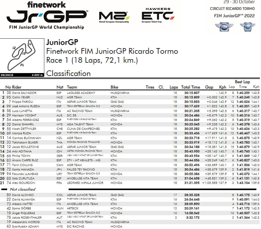 Dans le dernier tour, une lutte à quatre a vu David Salvador passer de la troisième à la première place avec une manœuvre audacieuse dans le dernier virage. David Alonso tente la même chose, mais se trompe et touche David Salvador avant de chuter, faisant également perdre un temps précieux à José Antonio Rueda. Dans une bagarre jusqu’à la ligne, David Salvador remporte l’une des finales les plus serrées de tous les temps, devançant Collin Veijer de 0.002s, avec Filippo Farioli troisième.
