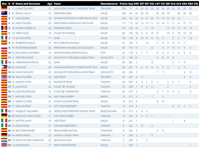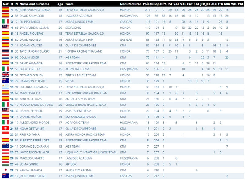 A seulement trois points de Farioli, Syarifuddin Azman (SIC Racing), qui avec trois podiums en 2022, est toujours mathématiquement en course pour la deuxième place, à 18 points de Salvador. Azman n’a pris que trois points lors de la dernière course et a perdu la troisième place au classement général, ce qu’il aura à cœur de récupérer. Il était quatrième à Valence plus tôt dans l’année dans la Course 2. A 13 points derrière lui, le meilleur rookie Ángel Piqueras (Team Estrella Galicia 0,0) compte trois podiums à son actif cette année. Après un premier podium à Valence plus tôt dans la saison, Piqueras est prêt à mettre une dernière charge pour s’approcher de la troisième place au classement général. Le vainqueur de la course de Valence en début de saison, David Alonso (Aspar Junior Team), est à onze points de Piqueras et espère décrocher un top 5 au classement général du championnat.