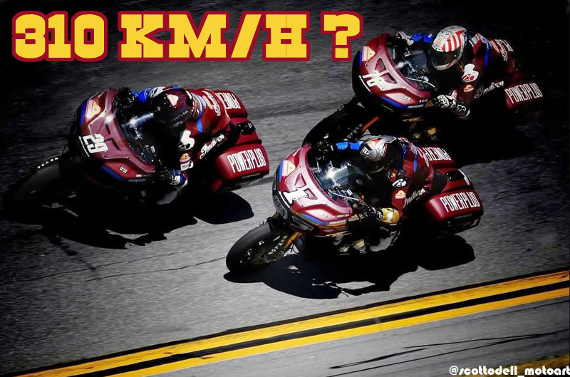 Bilan, selon le très spécialisé journaliste Sean Bice, Tyler O’Hara ( S&S/Indian Motorcycle) a propulsé son Indian Challenger à une vitesse impressionnante de 310 km/h (193,0 miles par heure) au quatrième tour sur les huit qu’il a parcourus lors de la deuxième course du championnat Mission King Of The Baggers à Daytona (304,16 km/h selon la feuille officielle) ! C’est plus vite que le plus rapide des participants au Daytona 200 qui autorise pourtant les Panigale V2 !