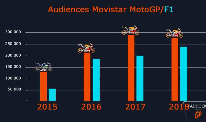 Mais attention ! On est très loin de l’idée tenace d’une Espagne passionnée par la moto au point de payer un quelconque abonnement (10 euros par mois pour les clients Movistar, avec la F1 incluse dans le pack Motor, beaucoup beaucoup plus pour les autres), et, depuis le départ de Mediaset, les chiffres d’audience étaient ridiculement bas pour un pays de 46 millions d’habitants soit-disant passionnés: en moyenne, 280 000 téléspectateurs en 2018, soit grosso modo les mêmes chiffres qu’en France sur Eurosport, et bien loin des 4 millions de téléspectateurs en Italie, répartis à 30/70 entre Sky (payant) et TV8/Cielo (gratuit).