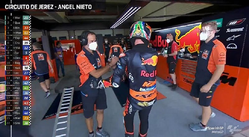 Florian, masqué au centre, accueille Brad Binder qui vient de réaliser le troisième temps en FP2 (voir tableau à gauche de l’écran)