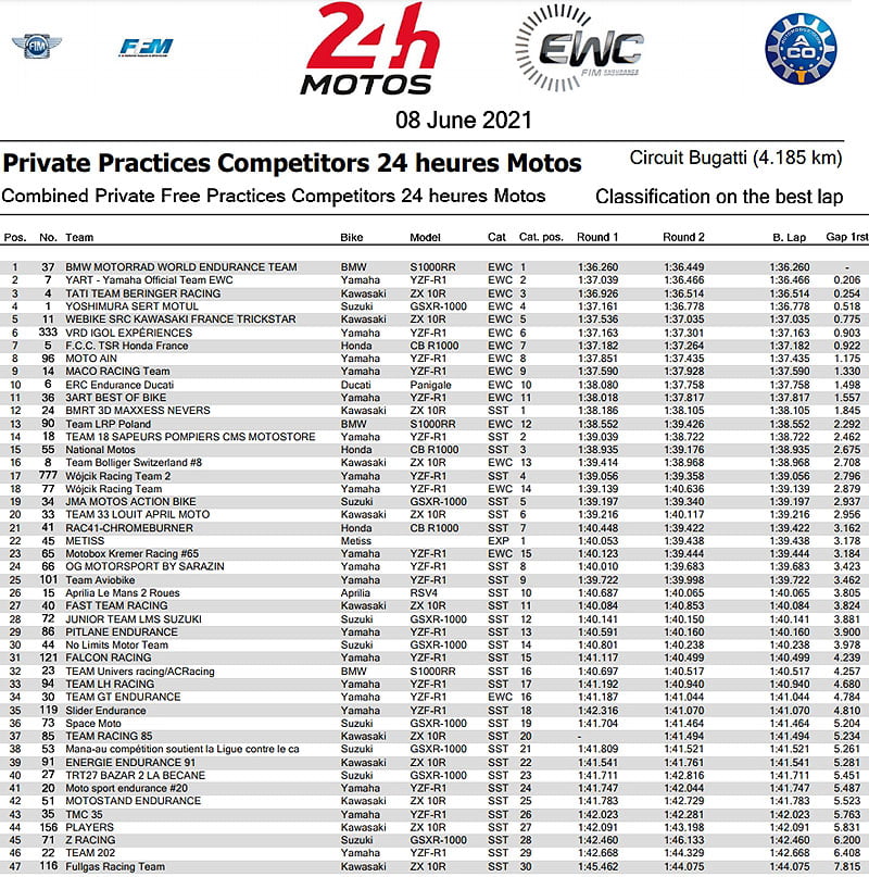 A l’issue de cette journée d’essais privés, les équipes officielles se pressent dans l’ordre suivant: BMW Motorrad World Endurance Team, YART Yamaha, Yoshimura SERT Motul, Webike SRC Kawasaki France Trickstar, F.C.C. TSR Honda France et ERC Endurance-Ducati