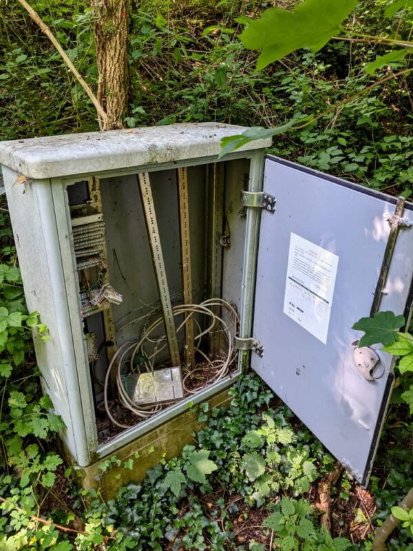 Cette marche se transforme bientôt en butte, puis en mur de sable. Ça y est, nous sommes au niveau d’Ostkurve. Un vieux transformateur, des pavés caractéristiques, un morceau de rubalise labélisé « Jaguar Racing »… Pas de doute, nous sommes sur un ancien circuit.