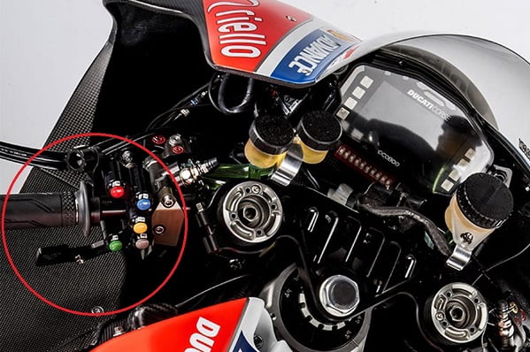 Pour limiter le patinage à l’accélération, Andrea Dovizioso commande son frein arrière avec un levier à main qui lui permet plus de finesse et de précision. On a vu que cela s’était avéré utile notamment sur des circuits comme celui de Barcelone dont le revêtement est en mauvais état.