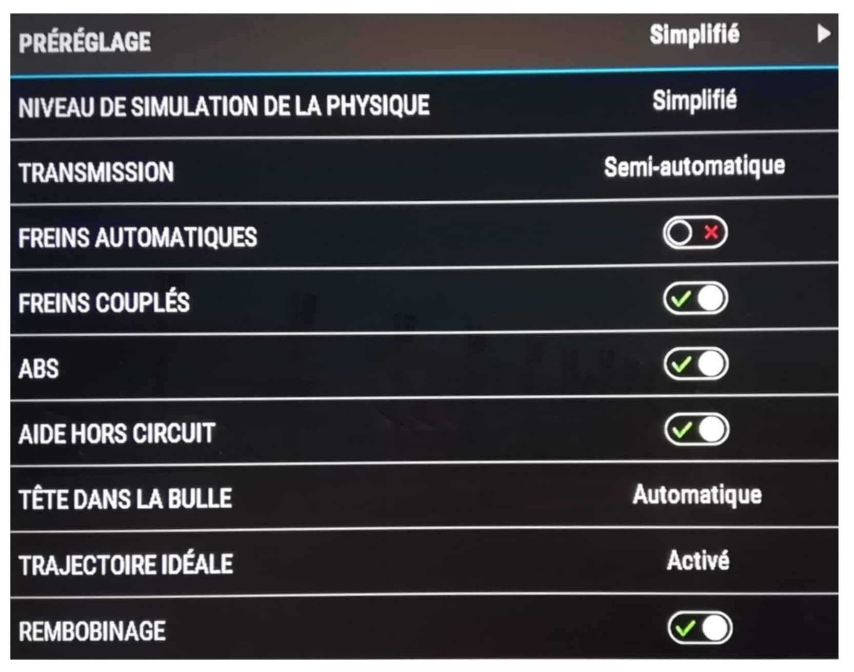 Et la maniabilité ? Ça reste le plus important. Là encore, c’est du domaine du pas trop galère. Je recommande à ceux qui cherchent le plaisir immédiat sans prise de tête de laisser toutes les aides activées (voir photo ci-dessous) et la difficulté IA  au plus bas (Très facile-20%). Ça donne un truc entre Simulation, on ne peut pas rester poignée en coin, et Arcade, on peut mordre dans le sable sans se vautrer et se prendre pour Rossi et Stoner à Laguna Seca 2008. Après, si vous voulez galérer à gérer frein avant/frein arrière, passage de vitesses, usure des pneus, etc, c’est votre problème. Quoi qu’il en soit, les sensations sont proches du réel quand on se met la tête dans la bulle, pardon, le jeu, et j’ai envie de dire que ceux qui ont de bonnes notions de pilotage pigeront plus vite que ceux qui… Bref, c’est qu’un fucking jeu, pas de polémiques…