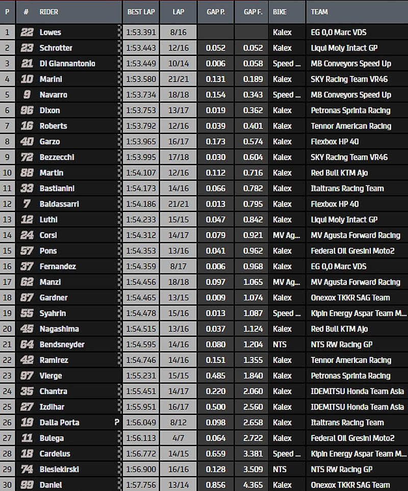 Fin de séance et Lowes conserve le meilleur temps en 1.53.391s devant Schrotter, Di Giannantonio, Marini et Navarro