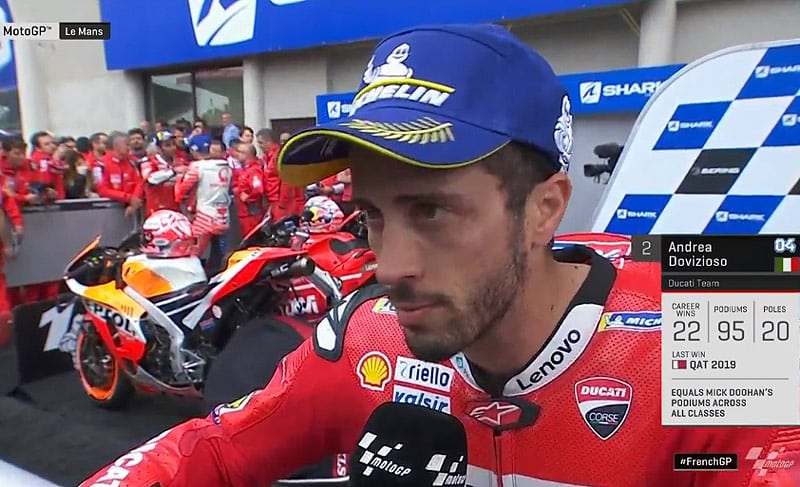 A peine descendu de sa Ducati GP19 officielle après avoir obtenu la 2e place lors du Grand Prix de France sur le circuit Bugatti au Mans, Andrea Dovizioso s’est confié devant la caméra du site MotoGP.com avec la petite frustration d’avoir fait du mieux possible, face à un Marc Márquez toutefois un peu plus rapide.